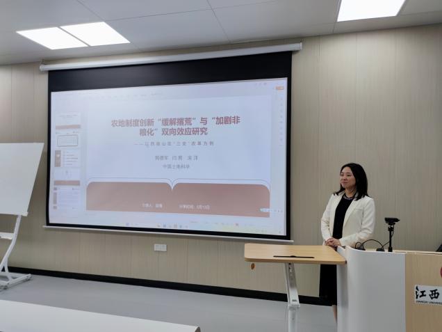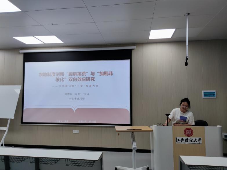 第二位进行文献分享的是吴倩同学,她分享的文献选自《中国土地科学》2023年第9期,题为“农地制度创新“缓解撂荒”与“加剧非粮化”双向效应研究”。文章探索农地制度创新——“三变”改革(资源变资产、资金变股金、农民变股东)对西南山区耕地撂荒与非粮化双向影响效应,为构建差别化的农地保护政策提供参考。