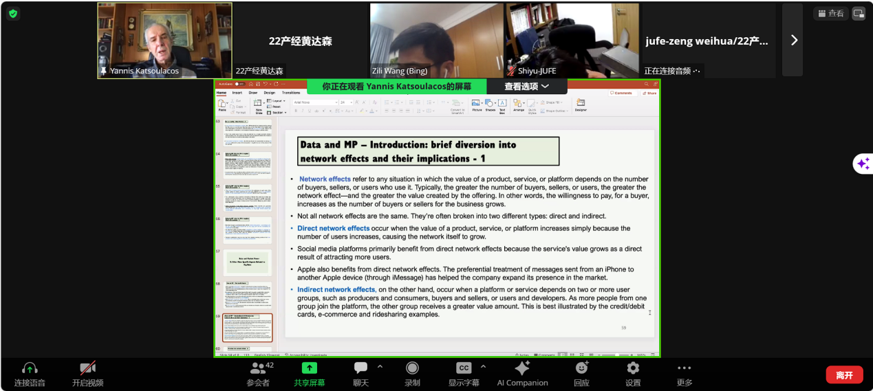 在12月18日至22日期间,江西财经大学客座教授Yannis Katsoulacos通过Zoom会议为我院2022级产业经济学硕士讲授了《欧美竞争与规制》课程,同时也有部分2023级产业经济学硕士以及教师参与了学习。这门课程由产业经济研究院院长王自力教授主持。