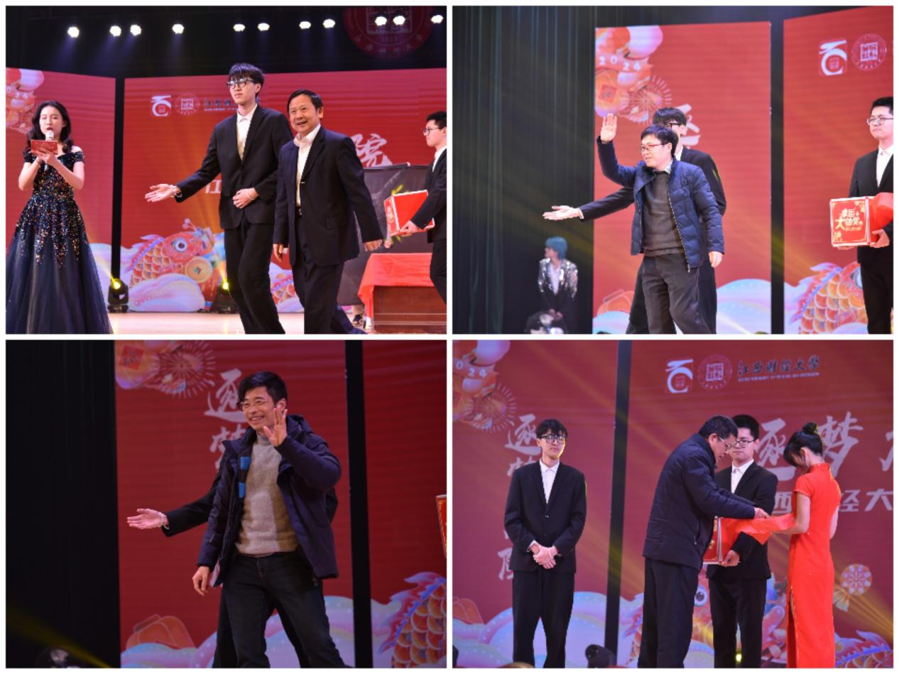 在各个精彩的节目之间,我们巧妙地安排了“龙行龘龘寻锦鲤”抽奖活动,为整场晚会增添了更多的互动和惊喜。特别荣幸的是,我们邀请到了江西财经大学的杰出领导作为抽奖嘉宾,包括江西财经大学党委书记卢福财教授、我院院长谢花林教授、产业经济研究院院长王自力教授和规制与竞争中心主任陈明教授。