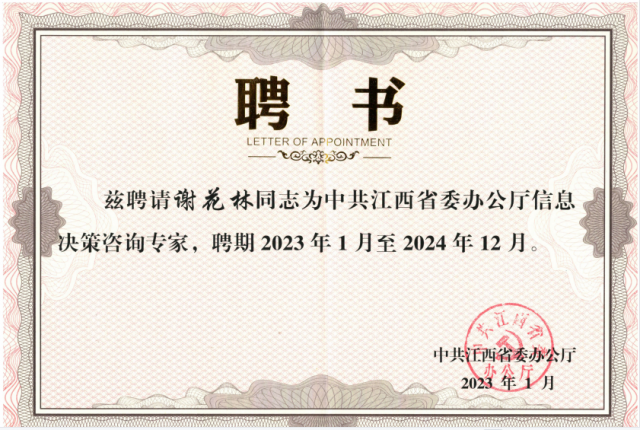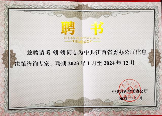 2023年1月,中共江西省委办公厅发布《关于确定省委办公厅信息决策咨询专家库人选的通知》,我院院长谢花林教授、副院长习明明研究员受聘为江西省委办公厅信息决策咨询专家。研究院将珍惜机会,努力将更多应用型研究成果转化为服务江西省委省政府和地方经济发展的咨政建议,更好发挥省级高端参谋智囊作用。
