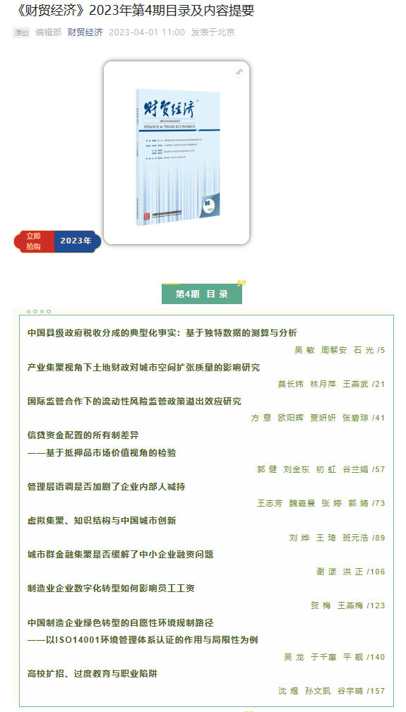 近日,以我院吴龙博士为第一作者、江西财经大学为第一单位的论文《中国制造企业绿色转型的自愿性环境规制路径——以ISO14001环境管理体系认证的作用与局限性为例》发表于国内权威期刊《财贸经济》(2023年第四期)。论文合作者为大连理工大学博士研究生于千惠和浙大城市学院讲师平靓。该文是吴龙博士主持的国家自然科学青年科学基金项目“集体声誉约束下质量认证促进制造企业全球价值链攀升的机制研究”(72203081)的阶段性成果。
