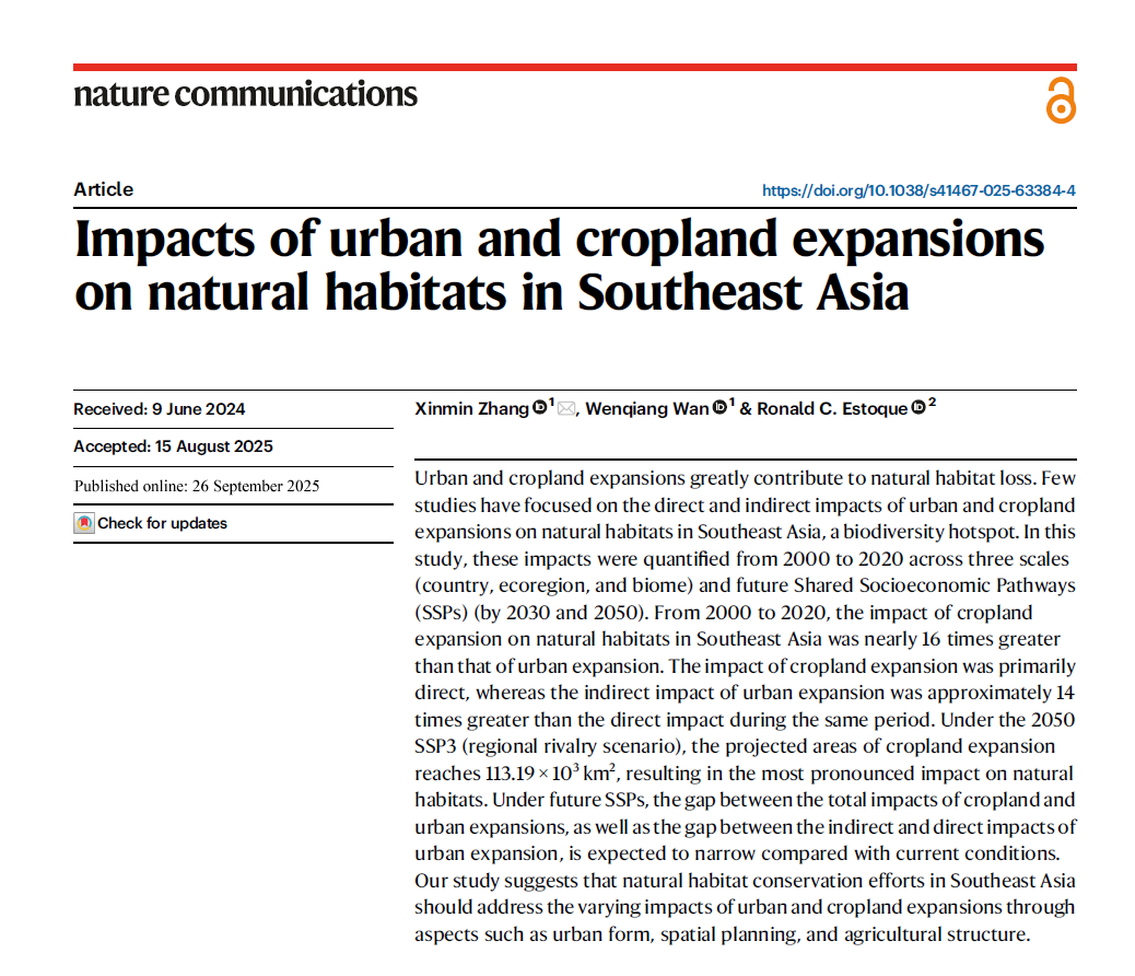 近日,我院教师张新民博士与其硕士生万文强在NatureCommunications上发表题为“Impactsof urban and cropland expansions on natural habitats in SoutheastAsia”的研究论文。NatureCommunications是Nature旗下综合性子刊,SCI中科院大类一区TOP期刊,2025最新影响因子15.7,是我校认定的国际A+类权威期刊。此次发表彰显了学院在生态环境领域的扎实科研基础与持续创新能力。